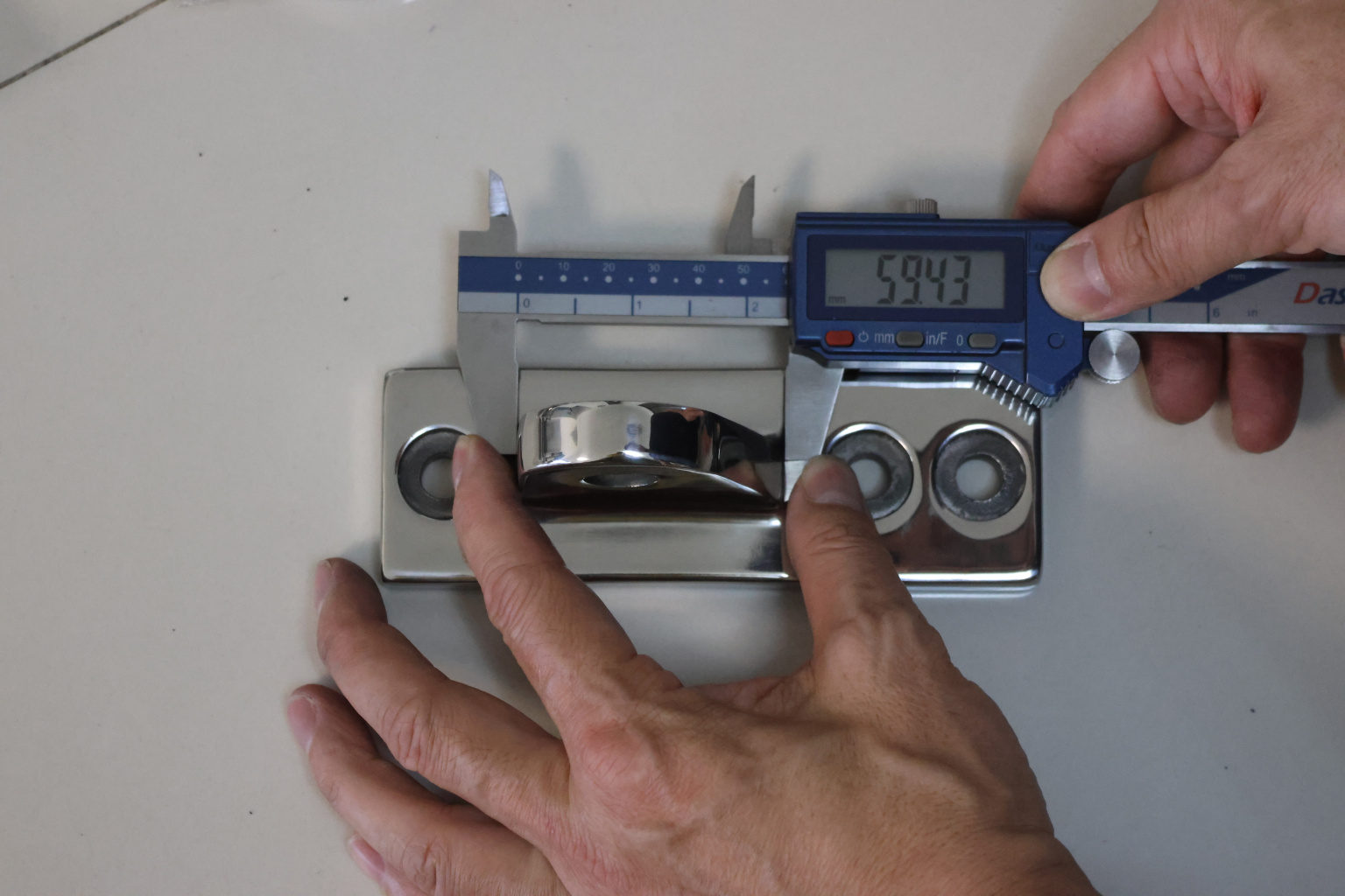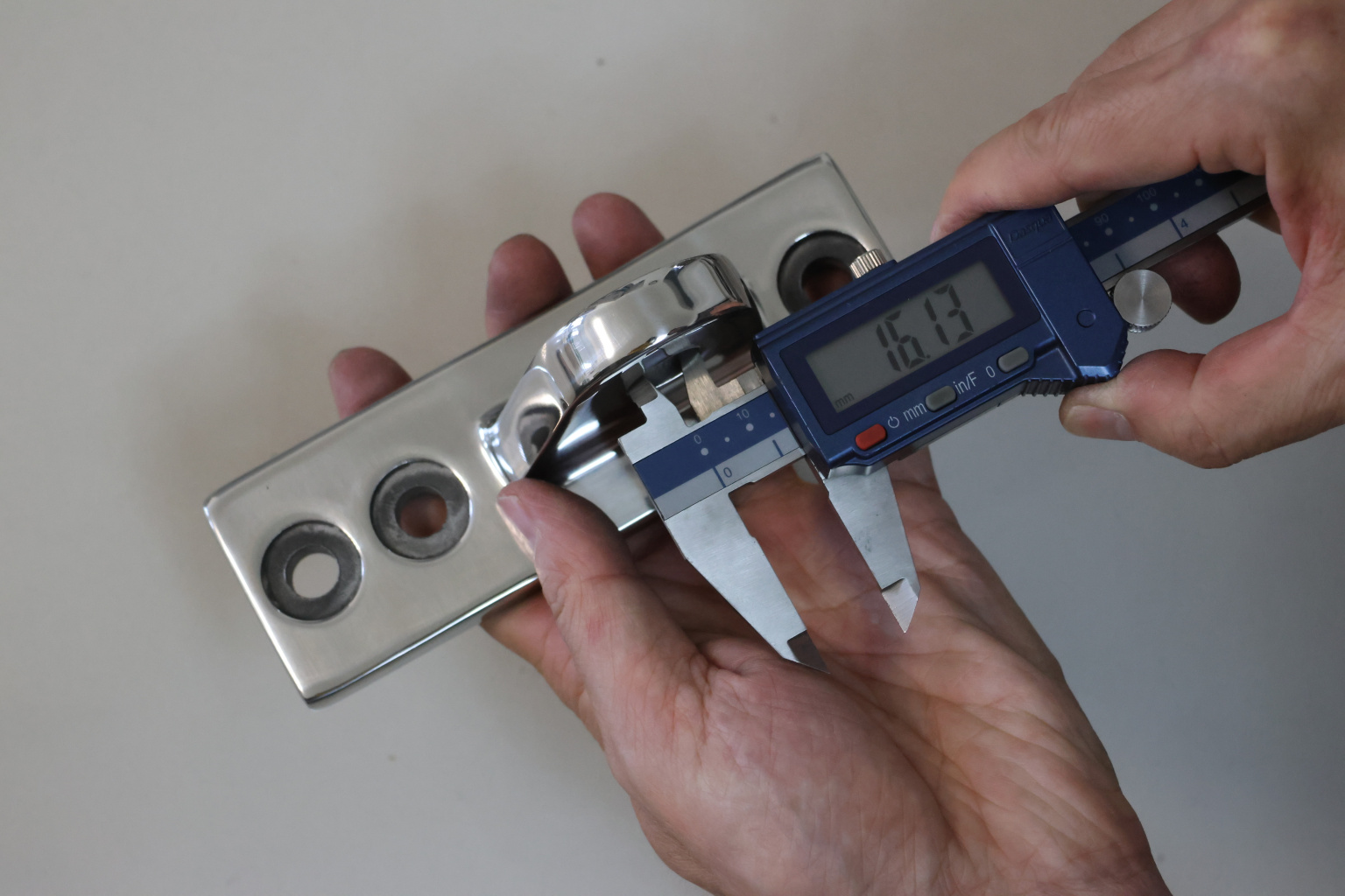 Крепление тяги к стойке. Полированная деталь. Состоит из крепёжного элемента с тремя технологическими отверстиями для крепления к стойке и выносной части с отверстием диаметром 16 мм для крепежа наконечника тяги. Выполнена из стали AISI 304. Ширина детали – 50 мм. Выносная часть выступает на 63 мм от стены.