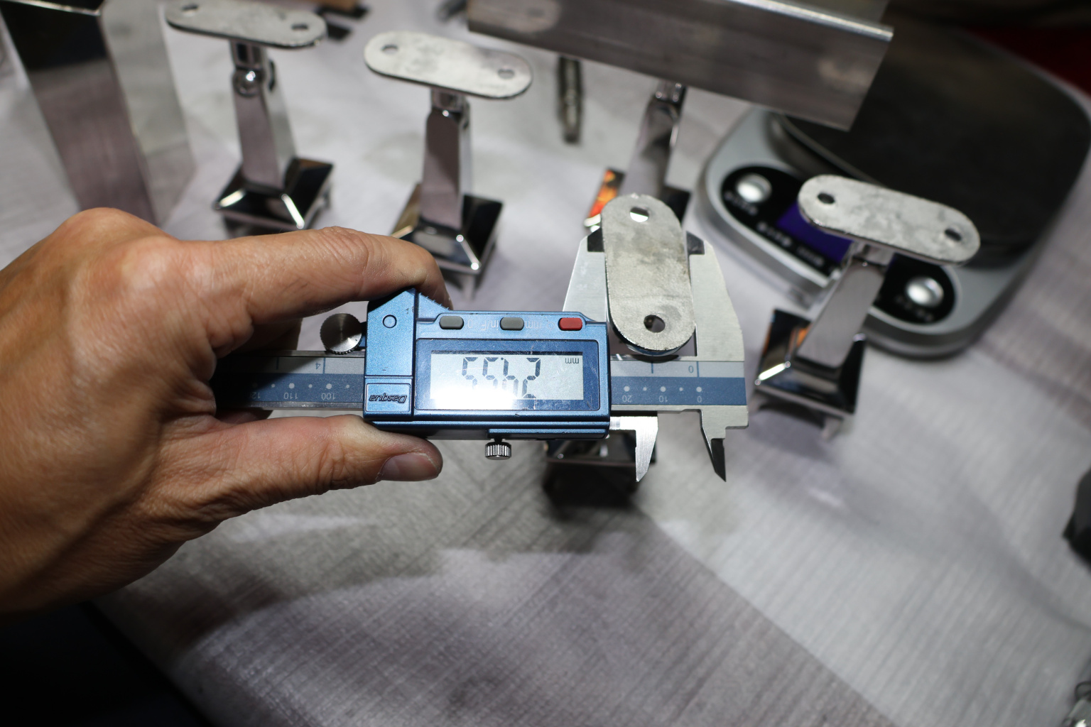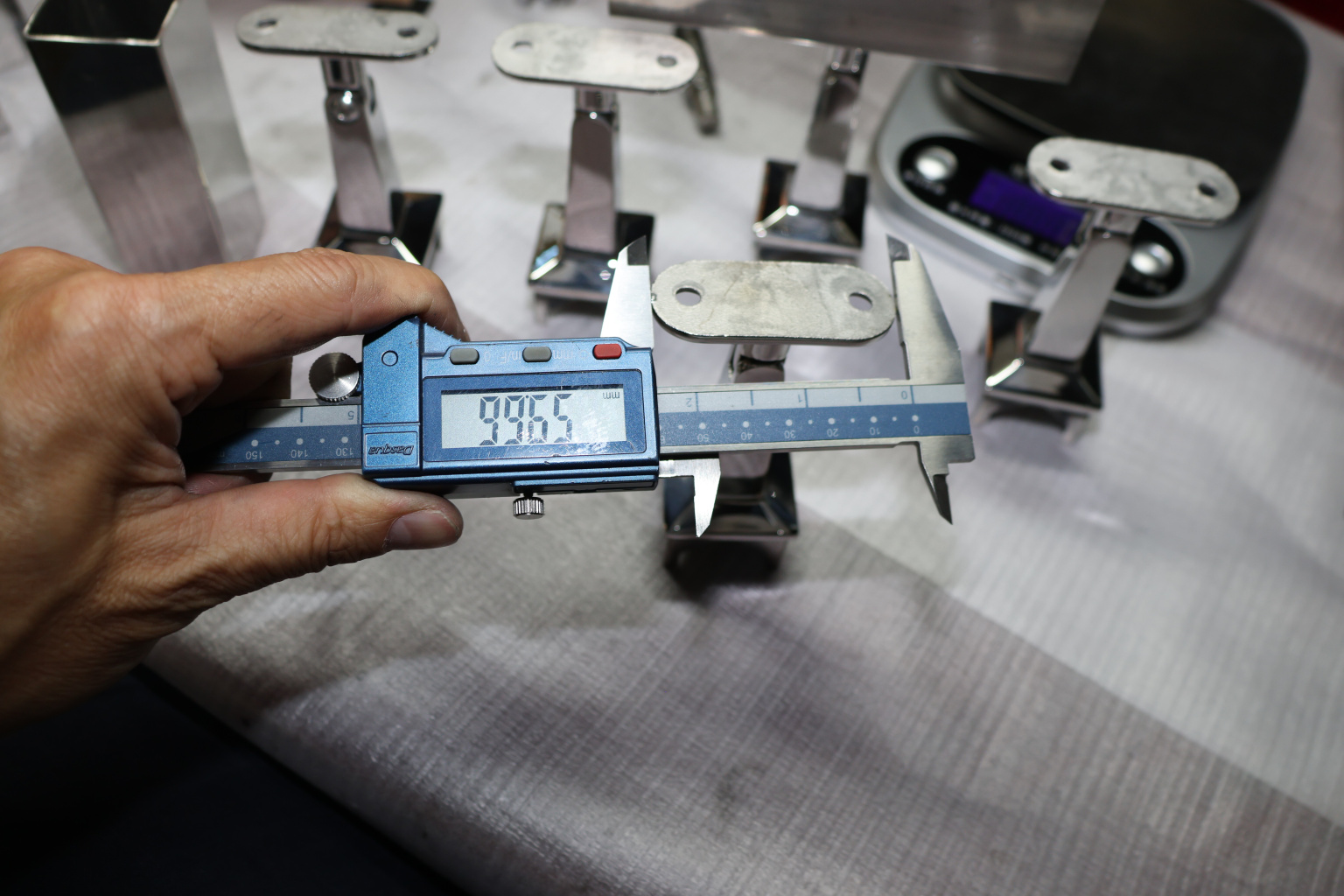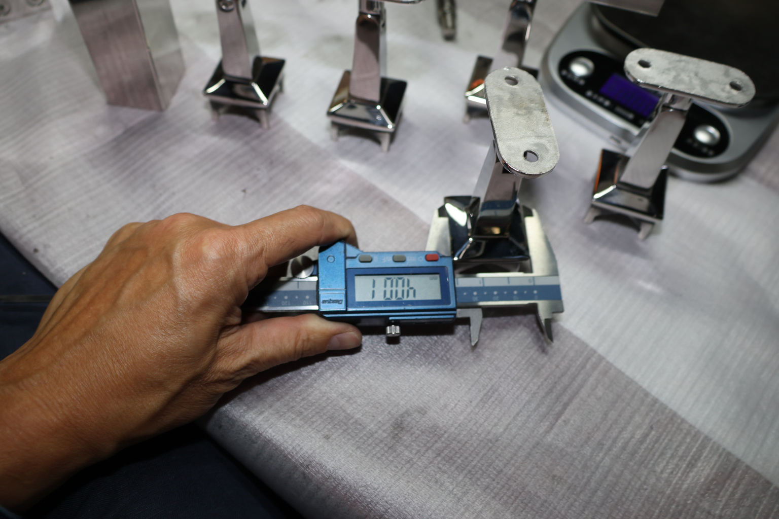 Наконечник на стойку из профильной трубы диаметром 40х40 мм, с регулируемым ложементом под плоскость. Наконечник литой, полированный, нержавеющий. Марка стали - AISI 304