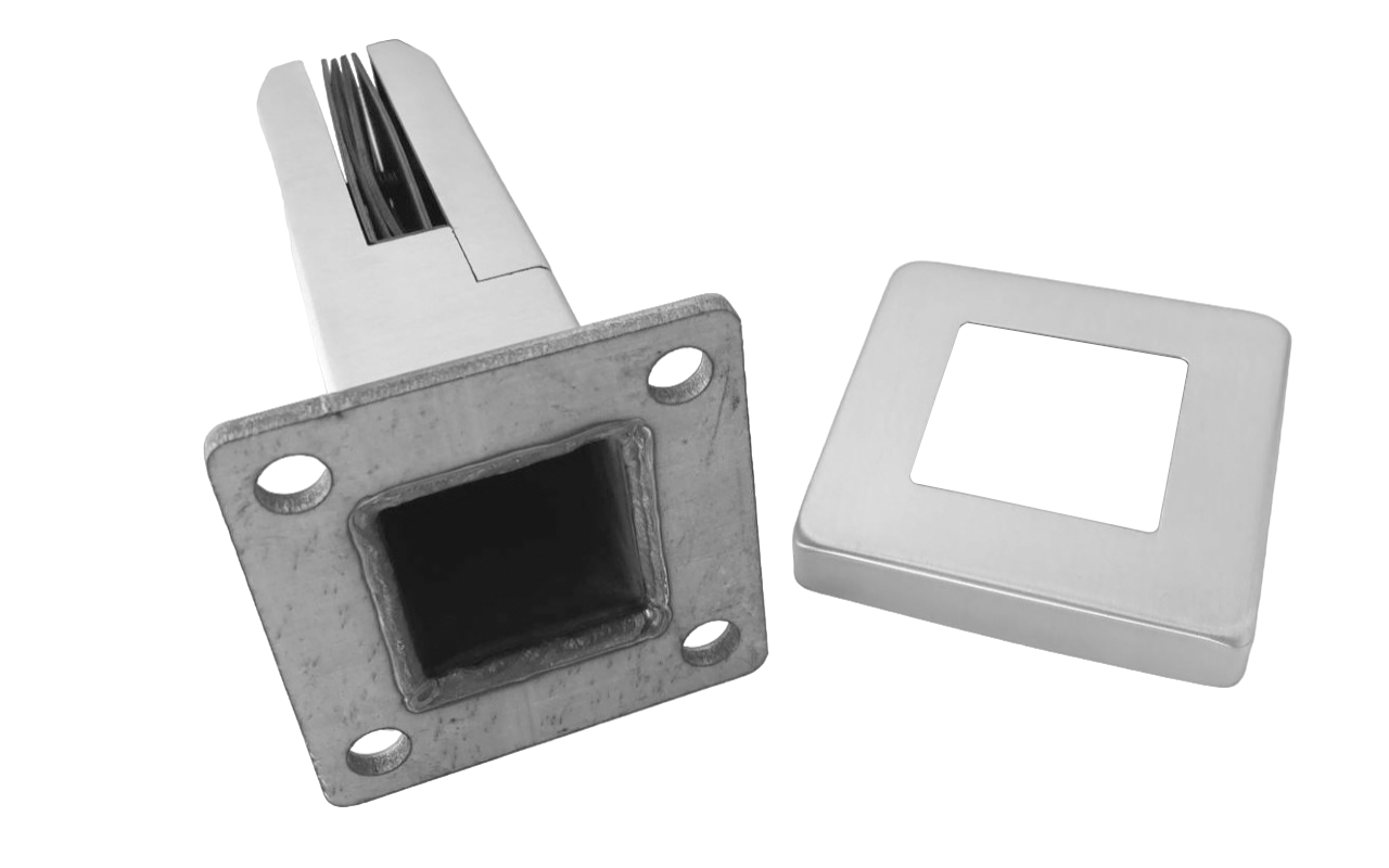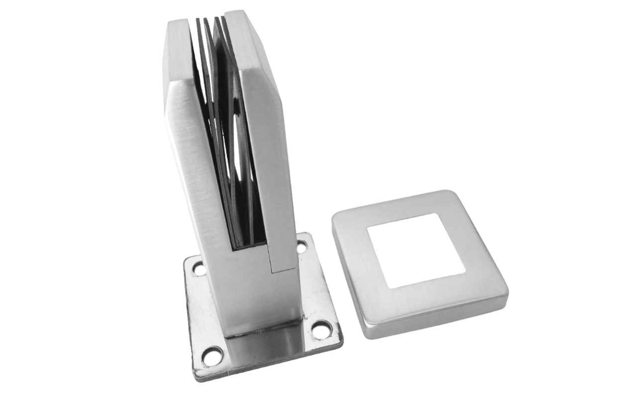 Стеклодержатель штампованный под стекло 8 мм (4+4 мм), квадратный, под стойку Ø38.1 мм (40х24х48), полированный (AISI 304) k351