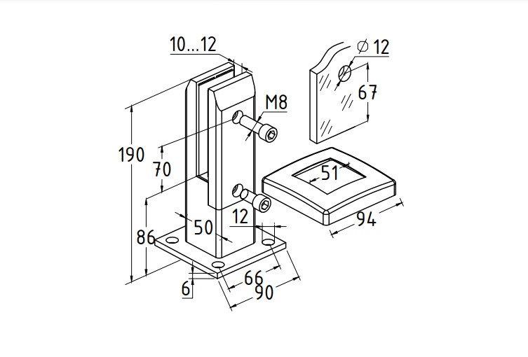 Стеклодержатель пластинчатый 3хМ8, по центрам 170х5 мм, полированный, шайбы 5 мм штамп., под стекло 6-12 мм, AISI 316 k023-8 купить в Уфе