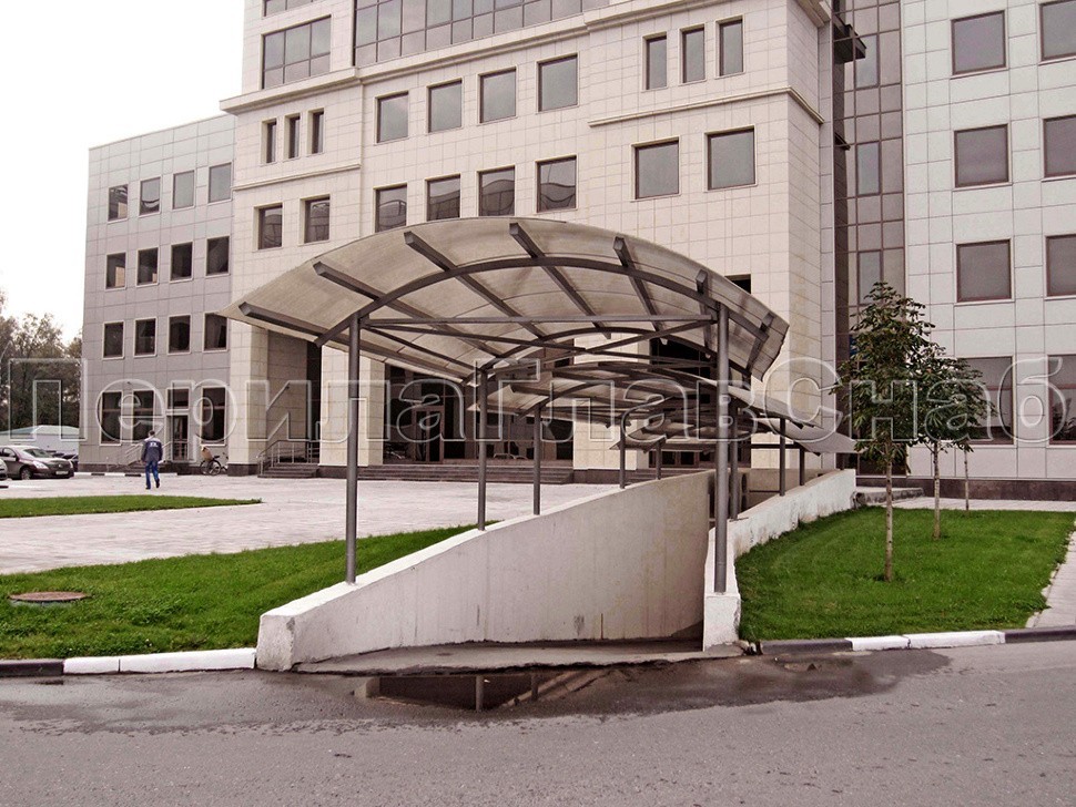 Каскад из трех козырьков с поликарбонатом над въездом в подземный гараж.В качестве опор использованы колонны из окрашенной нержавеющей стали.