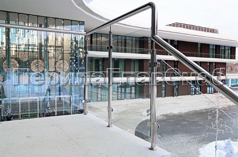 Ограждение лестницы со стеклом на зажимных стеклодержателях. Стойки с креплением в ступень с декоративными крышками.