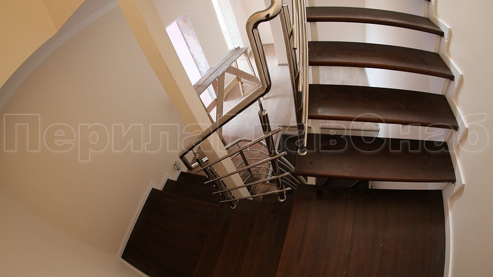 Заказчиком был одобрен предложенный нашими специалистами проект. Ограждение винтовой лестницы с первого по четвертый этаж выполнены из полированной нержавеющей стали с четырьмя ригелями, высотой 950 мм. Стойками диаметром 38,1 мм, низ стойки декоративный, ригель диаметром 16 мм, поручень полированная нержавеющая сталь диаметром 38,1 мм. Стойки устанавливаются в ступени с маршем сверху сквозь доску, фанеру в железобетон на шпильке с вклеиванием с шагом через две ступени на третью, в горизонте с шагом 900 -1200 мм.