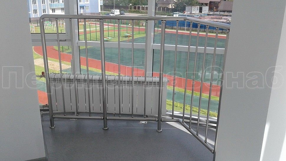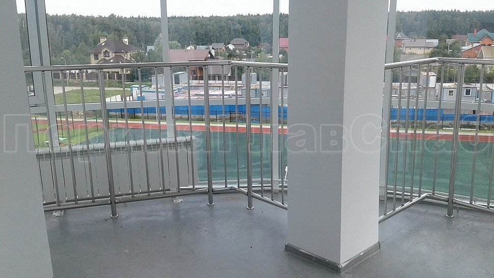 - Ограждения витражей зимних садов выполнены из полированной нержавеющей стали марки AISI 304 высотой 1200 мм от пола. Стойки трубой диаметром 38 мм крепятся в пол на глубину 70 мм при помощи бурения, установлены друг от друга на расстоянии 1000-1200 мм друг от друга. Между стоек вертикальным способом установлены ригели, диаметр трубки 16 мм. Вставляются в пазы перфорированной трубы с шагом 100 мм.