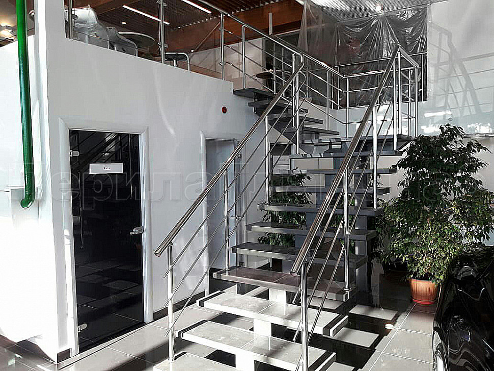 Автосалон всегда привлекает своим внешним видом, и здесь конечно же, должно быть все на высшем уровне, в том числе и лестница с ограждениями. Мы сделали достойную работу, установив ограждения, комбинируя стеклянные ограждения и станадртные 3-х ригельные.