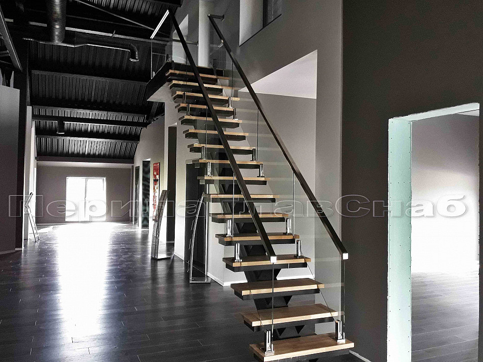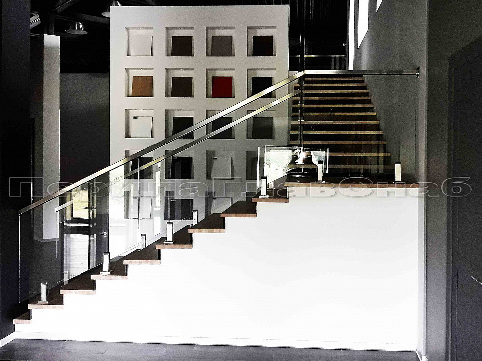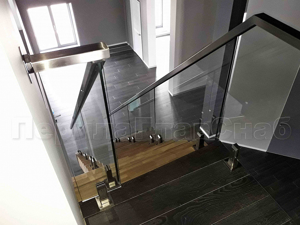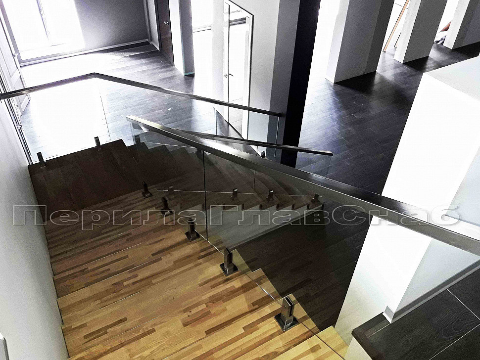 Было рассмотрено два вида крепления стеклянных ограждений, а именно на алюминиевом профиле и мини-стойках. Алюминиевый профиль в рамках этого конструктива установить нельзя, поэтому решение было принято сделать стеклянные ограждения на квадратных мини-стойках. Ограждения внутренние на несущем стекле, конструктив: высота 1000мм от уровня пола. Поручень выбрали с пазом – шлифованный, размер 60*40, благодаря текстуре шлифовки смотрится очень современно и стильно.
