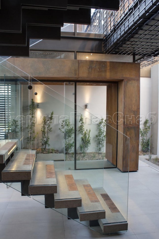 Ограждение лестницы с квадратными стойками и пластинчатыми стеклодержателями