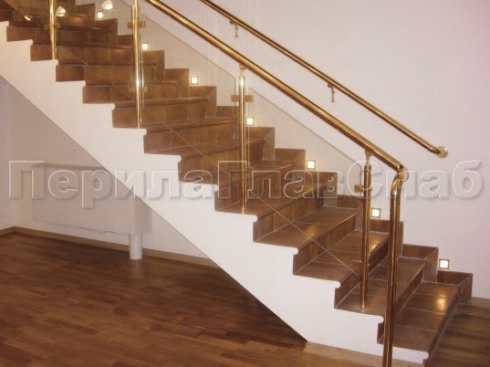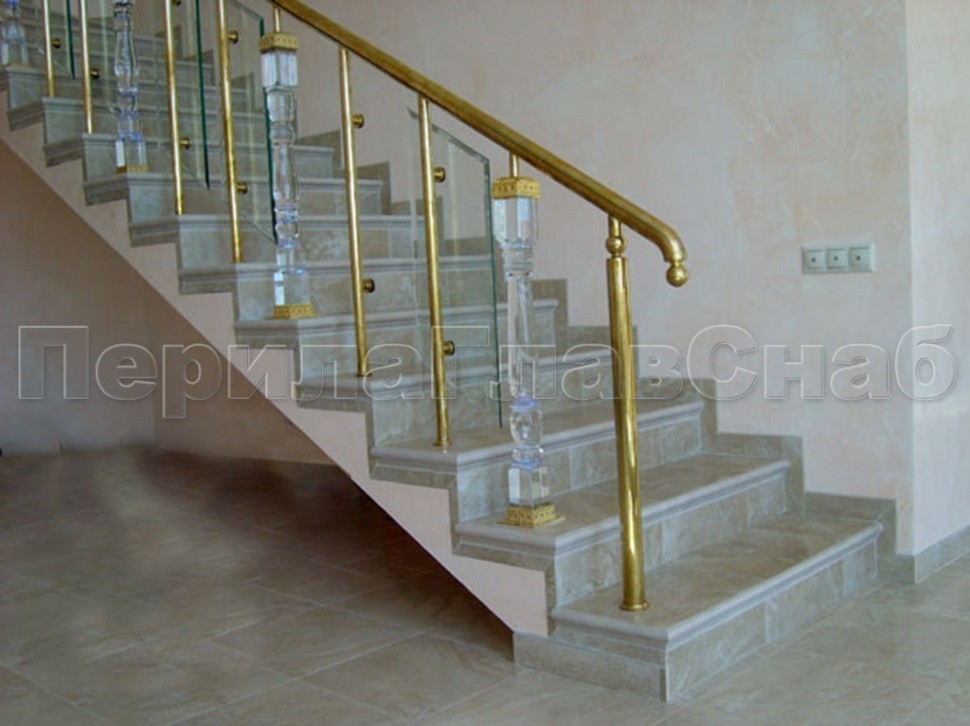 - Ограждение лестницы с прозрачным стеклом, стойками и поручнем из латуни
