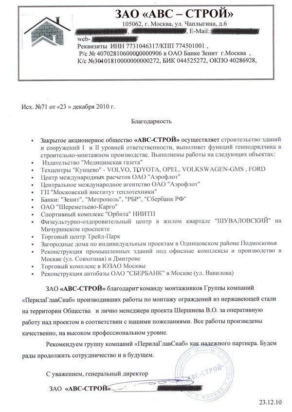 ЗАО «АВС-СТРОЙ» благодарит команду монтажников Группы компаний «ПерилаГлавСнаб» производивших работы по монтажу ограждений из нержавеющей стали на территории Общества, и лично менеджера проекта Шершнева В. О. за оперативную работу над проектом в соответствии с нашими пожеланиями. Все работы произведены качественно, на высоком профессиональном уровне.