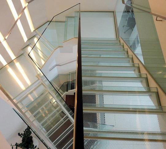 Стеклянные ступени и стеклянная площадка на лестнице